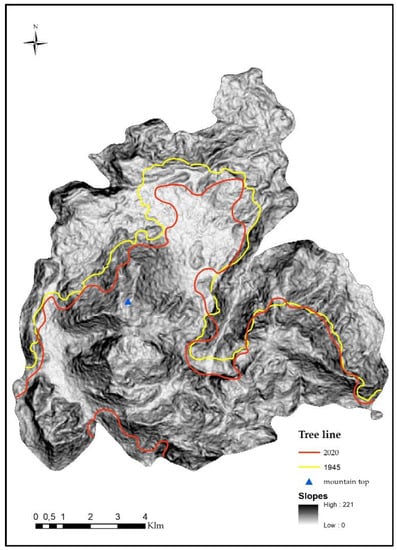 Treeline shifts between 1945 and 2020 in relation to the slopes on Mt Zireia.