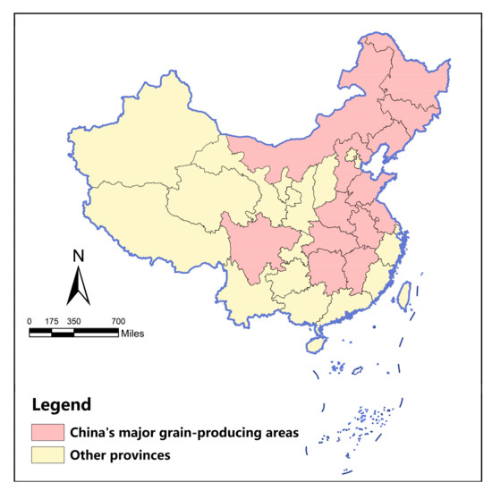 The study areas in this paper are China’s major grain-producing areas that are defined by the 2001 reform of the grain circulation system as 13 provinces (autonomous regions), viz., Liaoning, Jilin, Heilongjiang, Inner Mongolia, Shandong, Hebei, Henan, Jiangsu, Anhui, Jiangxi, Hubei, Hunan, and Sichuan [29,30] (Figure 1). Geographically, the study areas are divided into four regions: Northeast China (Liaoning, Jilin, and Heilongjiang), North China (Shandong, Hebei, and Henan), middle and lower reaches of the Yangtze River (Jiangsu, Anhui, Jiangxi, Hubei, and Hunan), and other regions (Inner Mongolia Autonomous Region and Sichuan) [31].