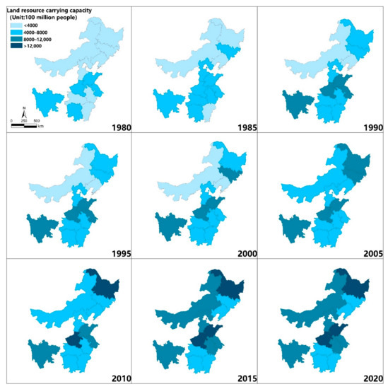 Figure 4 displays the carrying state of land resources in the 13 provinces of China’s major grain-producing areas in 1980, 1985, 1990, 1995, 2000, 2005, 2010, 2015, and 2020.The carrying state of land resources was reflected by the LRCCI. Additionally, the classification standard can be found in Table 1.
