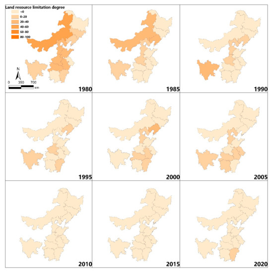 - As for the LRLD, most provinces of China’s grain-producing areas had negative values, which indicated that there was no limitation for land resources on population aggregation in most provinces. In fact, the LRLD decreased from 1980 to 2020 in the 13 provinces. In 1980, there were ten provinces with a positive land resource limitation degree; five of them had a 20–40 land resource limitation degree value and four of them had a 0–20 land resource limitation degree value. In contrast, in 2020, there was only one province with a positive LRLD value. This indicates that the land resources of the major grain-producing areas set rather small limits on the population’s size, with great potentials for LRCC to improve.