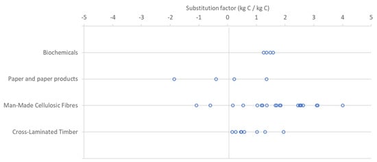 In general, MMCF have lower environmental effects than cotton and synthetic fibres. This is due in part to the use of renewable energy during the production process, the reduced use of chemicals, reduced GHG emissions, and lower water consumption [89]. Based on existing studies, using wood to produce textile fibres may lead to a substitution effect of −1.09 to 4 kg C/kg C (Figure 1; Table S1) [73,74,89], thereby providing potentially the largest substitution benefits across all product types considered in this study. The large range is partly explained by the number of life cycle stages considered in the studies, but also the type of fibre, the assumed production technology and the resource base have a significant effect on the estimated substitution factors. For instance, an integrated mill that produces wood pulp and textile fibres using modern technology and factory biomass for process energy was associated with lower levels of GHG emissions when compared to conventional production technologies that uses market pulp as feedstock [89]. Furthermore, the use of residues from sawmills and small logs could favour the development of industrial constellations, where small logs and industrial side streams would be used as raw material for wood-based textile fibres [18,88,90,91]. Some pulp mills have been converting their facilities from kraft pulp production to dissolving pulp production [92,93]. This shift can be seen as an advantage, especially if mills have the flexibility to produce paper-grade pulp or textile-grade pulp based on market conditions [83,88].