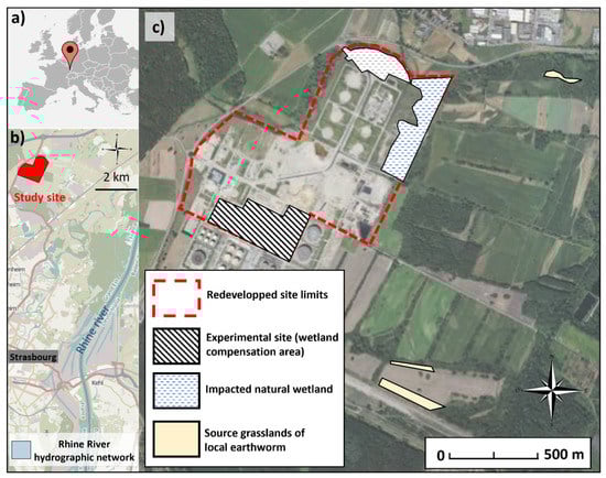 Figure 1. Study site location and delimitation. (a) Study site location in eastern France; (b) location of the site on the Rhine River floodplain; (c) experimental site and the grassland source area of the local earthworm communities. Map font sources: (a) Wikimedia common CC by SA2.0 [58]; (b) © OpenStreetMap, ODbl, CC-BY-SA 2.0 [59]; (c) Maps data, Google Earth,© 2022 Landsat/Copernicus [60].
