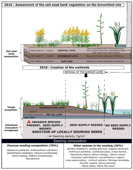 In 2016, a preliminary study (unpublished data) used the seedling emergence method to assess the site’s soil seed bank [61,62]. This preliminary assessment highlighted a limited seed bank and concluded a high risk of plant invasion (Figure 2).