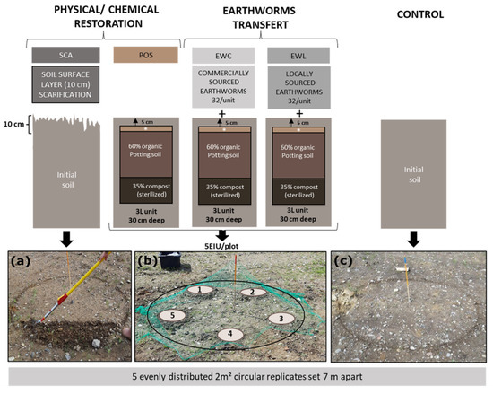 Figure 3. Description of the tested soil restoration techniques. Mechanical soil surface (10 cm deep) scarification (SCA, photo (a)). Earthworm inoculation techniques consist of the inoculation in the 2 m2 plot of 5 earthworm inoculation units (EIU; pinked number 1–5 circles) technique each containing 32 commercially sourced earthworms (EWC), 32 locally sourced earthworms (EWL), or no earthworms (POS). Labels 1–5: equidistant location of the five EIU in the replicate protected from birds by a net (b). Control (CTL) corresponds to plot where no techniques were applied (c). Photo G. Jacek, 2019.