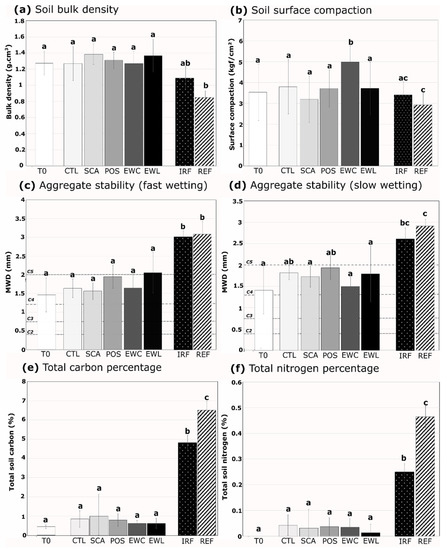 Figure 4. Soil characteristics (mean ± SD) of the sampling points at T0 and plots at T + 1 year. (a) Soil bulk density; (b) soil surface compaction; (c,d) stability of soil aggregates during (c) fast wetting and (d) slow wetting [67]. Mean weight diameter (MWD) corresponds to the post-treatment size of the lasting aggregates; classes of soil stability range from unstable (C2) to strongly stable (C4) (see [67]); (e) soil total carbon content; (f) soil total nitrogen content. Different letters above the bars (ac) indicate significantly different values at a 95% level of significance according to the Kruskal–Wallis or ANOVA test. See the Section 2.2 for soil restoration technique abbreviations.