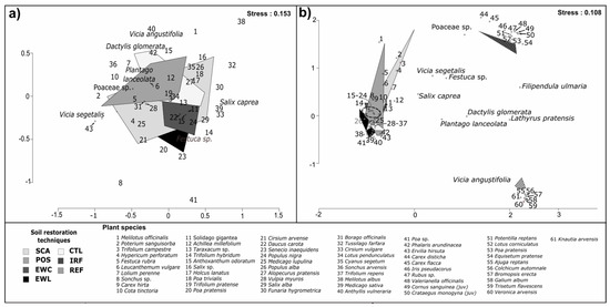 Figure 5. Nonmetric multidimensional scaling (NMDS) of plant species communities observed on the treated and reference sites. See the Section 2 for soil restoration technique abbreviations. (a) NMDS on experimental plots and references; (b) NMDS on experimental plots only to highlight the potential impact of the different techniques.