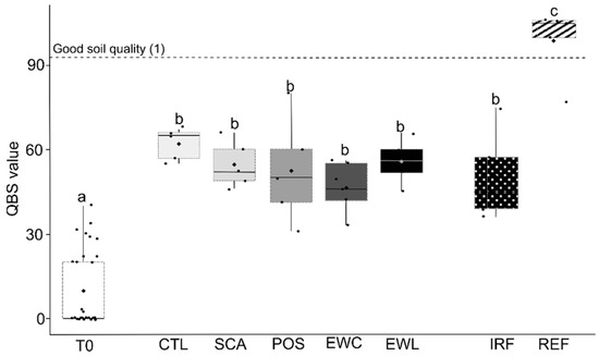 Figure 6. Boxplot of the soil biological quality results obtained using the soil biological quality index (QBS). Different letters above the bars (ac) indicate significantly different values at a 95% level of significance by 1 factor ANOVA. See the Section 2 for soil restoration technique abbreviations.