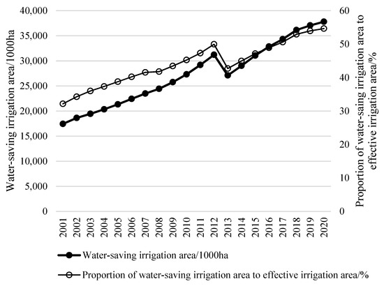 The water-saving irrigation area and its proportion to the effective irrigation area in China (2001–2020).