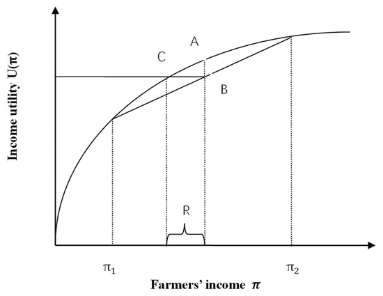 When farmers are risk averse to drought, R > 0; then, the utility function of farmers’ income is a concave function, that is, , . As shown in Figure 2, when farmers face drought risk, they may profit in two different ways, namely, and , with probability and , respectively. Assuming the same income, the income utility (point A) of the farmers that face the drought risk is greater than the expected utility (point B) of the farmers that do not face such risk. Following this, in order to avoid the risk of climate change, farmers are willing to spend R to adopt relevant measures to deal with drought. At this time, the income utility of point B and point C is the same, that is, .