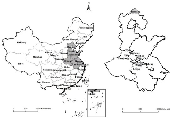 This study conducted a large-scale questionnaire survey of villages and farmers across five provinces in China. A stratified random sampling method was used. First, several counties were selected in each province. The sampled counties had to meet the following two criteria: First, the county had to have suffered, at least once during 2010–2012, from a most severe or a severe drought, which indicates a drought disaster year. Second, the county had to have experienced at least one year of relatively normal weather during 2010–2012, which indicates a normal year. According to China’s national standard for natural disasters, natural disasters can be classified into four categories according to their severity: most severe, severe, moderate, and small [44]. A year is defined as a disaster year if the local government declares a disaster warning with a most severe or severe level; otherwise, it is a normal year. Next, three townships were randomly selected from each sample county. Townships were selected based on the infrastructure condition of irrigation and drainage, which was divided into three categories: good, medium, and poor. In each county, one township was selected for each category. Then, three villages were randomly selected in each selected township. At last, 10 farmers were randomly selected from each selected village to answer a questionnaire survey. The selected farmers were mainly engaged in crop production, and detailed interviews were carried out on the largest two plots of each farmer. According to the data processing, the total sample included five provinces, Henan, Hebei, Shandong, Anhui, and Jiangsu, 11 counties, 33 towns, 99 villages, 988 farmers, and 1880 plots (Table 1).