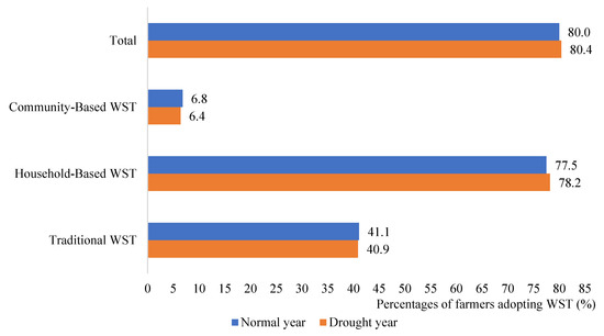 Figure 4 presents a descriptive analysis of the adoption rates of the three types of WSTs in a drought year and a normal year. Overall, the proportion of farmers adopting WSTs is 80.4% in drought years and slightly higher than 80.0% in normal years. Among the three types, household-based WSTs are the most widely used (77.5–78.2%), followed by traditional WSTs (40.9–41.1%) and community-based WSTs (only 6.4–6.8%). It seems that there is little difference in the proportion of farmers adopting WSTs between drought and normal years. This is because agriculture is not rainfed in this area. In other words, whether it is drought year or not, farmers have to choose one of the WSTs to irrigate their crops. Here, it is interesting to know whether the occurrence of drought is a key factor affecting the selection of WST types.