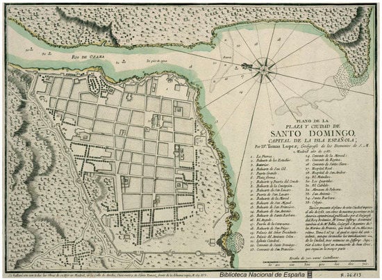 “Population Map of Santo Domingo” by Tomás López, 1785 (Plano de la Plaza y Ciudad de Santo Domingo, Capital de la Isla Española [Material cartográfico]/Por Dn. Tomas Lopez, Geógrafo de los Dominios de S.M.). Source: Biblioteca Nacional de España: http://bdh-rd.bne.es/viewer.vm?id=0000036042 (accessed on 8 September 2022).