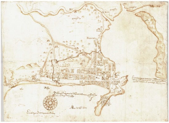 The discussion about the regularity or irregularity of the urban layout of the city of Panama Viejo was initially based on cartography. The first known plan of the city in contemporary times was the “Plan of the City of Panama and the site where the Royal Houses and Perico and other islands are” of 1609, which was attributed to Cristóbal de Roda. Later came the “Plan & prospective of the City of Panama” of 1586, attributed to Bautista Antonelli (Figure 2) and released at the end of the 1980s [] (pp. 116–117).