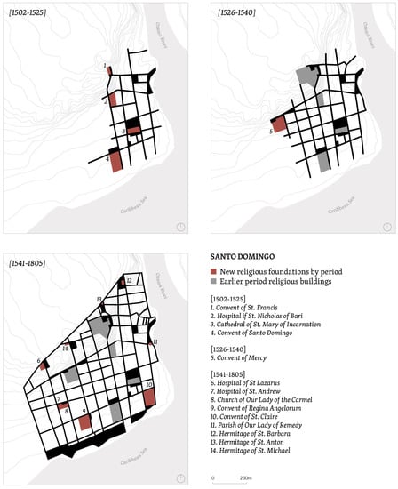 Evolution of the city of Santo Domingo through religious buildings. Source: Authors based on historical cartography and recent hypotheses [,].