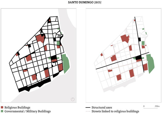 Main axes of the city of Santo Domingo and secondary axes linked to religious buildings. Source: Authors based on historical cartography and recent hypotheses [,].
