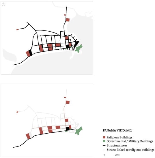 Something similar occurs in Panama Viejo, although due to the fact that the city did not manage to expand as much, especially due to its geographical or natural limitations [], the scale of the intervention is smaller. Therefore the grid conception is less obvious compared to Santo Domingo. In the early years (see Figure 4), the cathedral is also seen to be located in the Plaza Mayor, and from this point of intersection, the main axes depart both to the north and to the west, where the religious buildings will be located. In this case, the convents also serve as a delimitation of the colonial urban space, having been placed on the outskirts of the city. However, they did not serve as expansion nodes but rather as nodes of geometric consolidation of the existing plot, shaping the streets and plots that we know today.