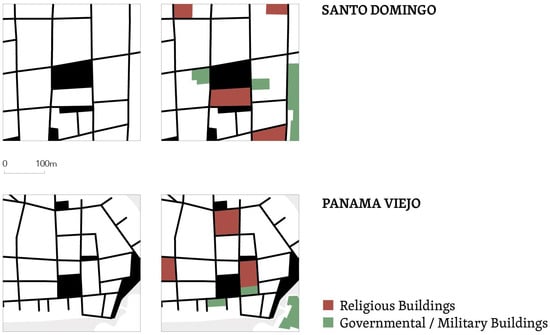 Religious buildings, with the exception of cathedrals—always located next to the Plaza Mayor and the City Council in a central location—are going to have a common denominator since monastic buildings and hospitals are going to be built at the farthest ends of the town [], marking the limits of the growth of cities, as we will see in the cases of Santo Domingo and Panama Viejo, and as was being done in Europe before this [] (p. 23). While close to the port, this is where all the commercial activity was concentrated—Royal Houses, Royal Audience, or the shipyards—around the convents and temples, giving rise to centers of population attraction, since in addition to ecclesiastical and oratory use itself, they generated work in their gardens, kitchens, and stables [] (p. 2), which ended up giving rise to the different neighborhoods of the city and, therefore, its urban expansion.