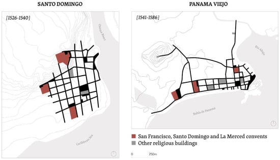 In the present investigation, we study the influence of conventual foundations on the origin of the urban layout of two of the first cities in the Spanish colonization of America: Santo Domingo (1502) and Panama Viejo (1519), examples of early colonial urbanism. Starting with cartography and historical bibliography, as well as recent studies on their urban evolution and using Geographic Information Systems (GIS) for graphic representation, a comparative study is carried out between both cities divided into stages of urban expansion until their consolidation (or disappearance in the case of Panama in 1671). We have been able to verify how, in Santo Domingo, the religious orders settled on the outskirts of the city, marking the axes of expansion as an instrument of control and consolidation of an urban layout closer to the idea of a grid, which will materialize more precisely in later cities. Meanwhile, in Panama Viejo, the city was formed longitudinally on the streets occupied by the convents, which served as the main axes that defined the urban design of the city. This article aims to demonstrate the importance of the role of religious power in the formation of the cities presented here.