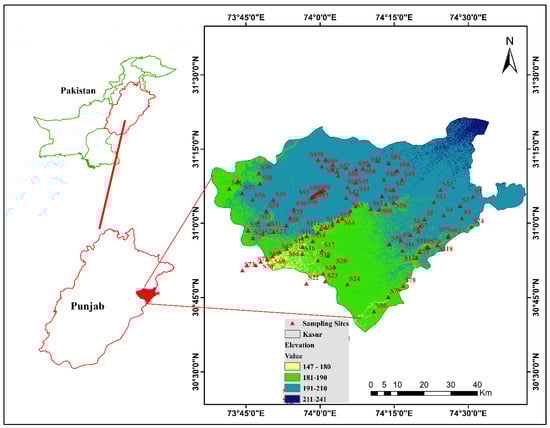 District Kasur is situated 150 to 240 meters above sea level and located southeast of Lahore (31°12′ N and 74°44′ E). The total area of district Kasur is 3995 km2 and is surrounded by River Satluj in the South and Ravi in the North. It is bounded on the north by Lahore district, on the east and south-east by India, on the south-west by Okara district, and on the north-west by Nankana Sahib District Tehsils, namely Kasur, Chunian, Pattoki, and Kot Radha Kishan. Topographically, Kasur district is a semi-arid plain and basin area of Sutlej riverine District Kasur is famous for Changa Manga National Forest, Balloki Headworks, and Ganda Singh Border (Figure 1). The climate of district Kasur is moderate []. During summer, the climate is hot, and the temperature rises above 40 °C. The highest temperature was noted during the month of June and the lowest temperature was noted during the month of January. The highest rainfall was recorded during the month of July, more than 120 mm. The winter session extends from December to February. The temperature fluctuates between 20 and 6 °C. The average annual rainfall is 500 mm [].