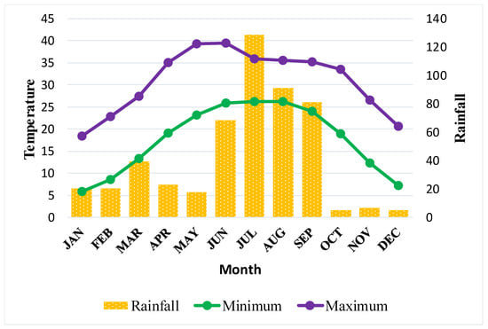 The climate data (precipitation, wind speed, humidity, and temperature) of district Kasur were acquired from the Pakistan Metrological Department (PMD) (Figure 2). Floristically, it falls in the Sahara Sindian region and hosts a significant number of plant species. The vegetation includes xerophytic and thermophilic species in the open and arid areas, but riverine belts host several macrophytes. The agricultural lands host weeds and ruderal species, e.g., Ageratum conyzoides, Amaranthus Viridis, Coronopus didymus, Chenopodium album, Convolvulus arvensis, Cypreus rotundus, Cynodon dactylon, Oxalis corniculata, Rumex dentatus, Melilotus parviflora, and Eragrostis poaeoides [].