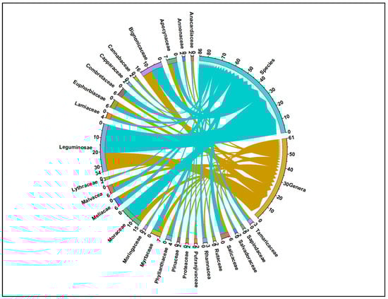 Chord diagram showing the number of species and genera in each family recorded from semi-arid lowland of Punjab, Pakistan.