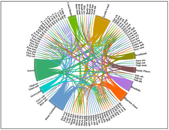 Chord diagram showing the woody species distribution in different habitat types of semi-arid lowland of Punjab, Pakistan.