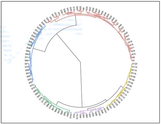An agglomerative hierarchical clustering dendrogram of the 120 sampling sites, illustrating the five woody plant communities in the semi-arid lowland Punjab, Pakistan.