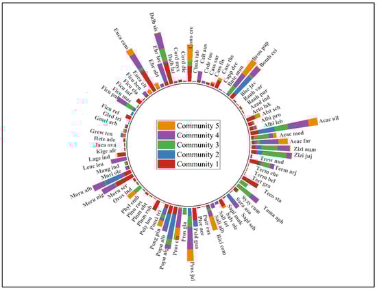 Radial stack bar plot showing the IV of woody species in different communities recorded from semi-arid lowland Kasur Punjab, Pakistan.