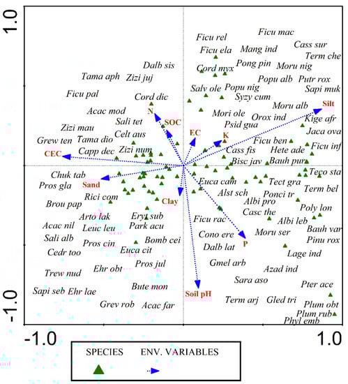 The woody species that are sensitive to pH and phosphorus (P) include Albizia procera, Alstonia scholaris, Bischofia javanica, Cascabela thevetia, Albizia lebbek, Gleditsia triacanthos, Plumeria obtusa, Plumeria rubra, Phyllanthus emblica, Lagerstroemia indica, Gmelina arborea, Conocarpus erectus, Tecoma stans, Saraca asoca, Tectona grandis, and Polyalthia longifolia. Soil moisture and soil texture (sand and clay) also have an impact of distribution of grasses. However, the woody species that are positively associated with their values comprise Acacia farnesiana, Bombax ceiba, Prosopis cineraria, Butea monosperma, Erythrina suberosa, Ehretia laevis, Acacia nilotica, Prosopis cineraria, Sapium sebiferum, Cedrela toona, Eucalyptus citriodora, Leucaena leucocephala, Parkinsonia aculeate, Broussonetia papyrifera, Grevillea robusta, Prosopis glandulosa, Chukrasia tabularis, Ehretia obtusifolia, Trewia nudiflora, and Salix alba. The species impacted by nitrogen (N), soil organic carbon (SOC), and cation exchange capacity (CEC) include Dalbergia sisso, Ziziphus jujuba, Ziziphus nummularia, Acacia modesta, Celtis australis, Salix tetrasperma, Tamarix aphylla, Tamarix dioica, Cordia dichotoma, Capparis decidua, and Grewia tenax. The species that were sensitive to electrical conductance (EC), potassium (K), and silt include Bauhinia purpurea, Heterophragma, Ficus elastica, Ficus infectoria, Ficus religiosaMangifera indica, Putranjiva roxburghii, Cordia myxa, Ficus macrophylla, Salvadora oleoides, Syzygium cumini, Kigelia africana, Cassia surattensis, Morus alba, Morus nigra, Cassia fistula, Pongamia pinnata, and Terminalia chebula (Figure 7).