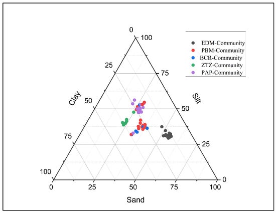 Silt, sand, and clay were significantly associated with woody community distribution and the relationship between EDM, PBM, ZTZ, PAP, and BCR woody communities was shown in a ternary with the aforementioned three edaphic factors (Figure 8). According to the soil composition based on these three variables, it was also possible to clearly see a clustering in the woody communities. EDM-community was hosted by soil having sandy texture and PAP-community hosted by soil having silty texture. The other three communities (PBM, BCR, and ZTZ) were hosted by soil having equal percentages of silt, sand, and clay (Figure 8).