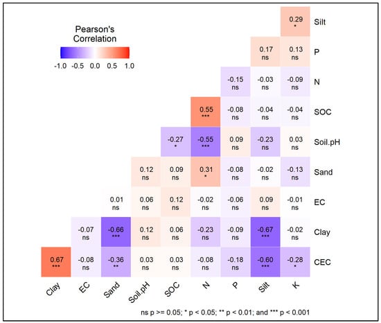 The interrelationship between several soil factors was calculated using Pearson correlation. Silt is positively correlated with potassium (K), soil organic carbon (SOC) and clay are positively correlated with nitrogen (N), and clay is also positively correlated with the cation exchange capacity (CEC) of soil. Sand and silts are negatively correlated with cation exchange capacity (CEC) (Figure 9).
