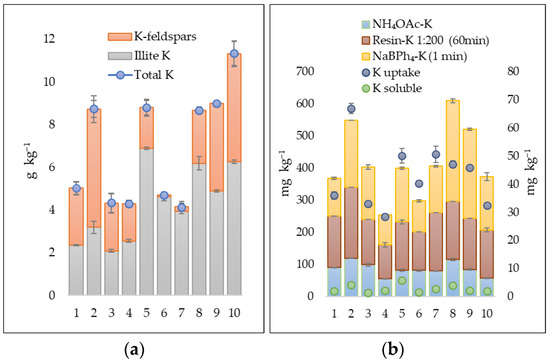 Distribution of K amounts from different soil K pools as extracted by respective extraction procedures: (a) total K; illite K; K derived from feldspars, and (b) readily available K (soil solution K); exchangeable K (NH4OAc-K); amounts of K reflecting the rate of solution Κ replenishment (NaBPh4-K, resin-K); K uptake by plants (For Figure 1b, bars are referenced in the left vertical axe, markers at the right); The error bars represent the standard error of the mean at the 95% confidence level (p ≤ 0.05); 1–10: soil samples numbering.