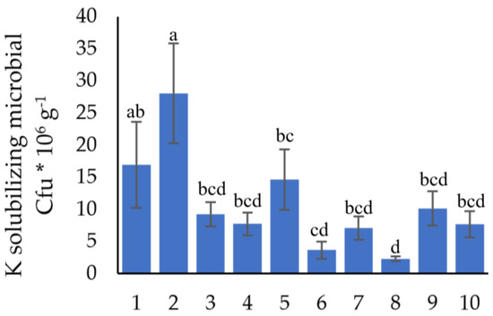 Rhizosphere K-solubilizing bacterial abundance. The error bars represent the standard error of the mean at the 95% confidence level (p ≤ 0.05, n = 3). Comparisons were performed by LSD test (p ≤ 0.05) and are demonstrated with lowercase letters. The presence of a common letter between each column implies no significant difference; 1–10: soil samples numbering.