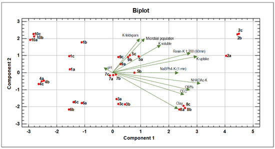 The PCA analysis revealed that the major portion of the total variance (85.6%) of the studied variables (plant K-uptake, soil K pools, and selected soil properties) was grouped between four components, and two of them explained almost 63% of it (Figure 3). According to these results, K uptake by plants, NH4OAc-K, resin extracted K, alongside with the OM% parameter, were the variables recording the higher weights of the first component, whereas the rhizosphere K solubilizing microbial population, K derived by feldspars, and clay content determined the variability of the second. In addition, the convergence of the vectors that represent both the microbial population and K-derived by feldspars, as well as K uptake and resin-extracted K, denote respective positive correlations.