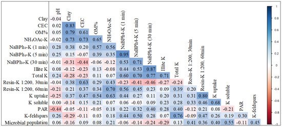 Pearson correlation matrix between K uptake, microbial population, soil parameters, and respective patterns of K amounts derived from different soil K pools. PAR is the potassium adsorption ratio; CEC is the cation exchange capacity, OM is the organic matter content; NH4OAc is the ammonium acetate extracted K; NaBPh4 is the sodium tetraphenylboron-extracted K. Blue color indicate positive correlations; red color indicate negative correlations.