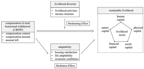 The Chinese government has implemented a homestead withdrawal policy to improve the efficiency of rural construction land use. The compensation for rural homestead withdrawal (CRHW) is crucial to the reconstruction and sustainable development of farmers’ livelihoods. This paper analyzed the response mechanisms of farmers’ livelihoods to the CRHW with the combined application of the logistic regression, the mediation effect model, and the moderating effect model. The results indicated that CRHW had a significant positive impact on the sustainable livelihoods of rural households, mainly by improving the physical capital and social capital. In addition, adaptability and livelihood diversity played intermediary and regulatory roles in the positive impacts of the CRHW on sustainable livelihoods, respectively. The conclusions may provide insight into the demand for more reasonable compensation policies to ensure the sustainability of farmers’ livelihoods.