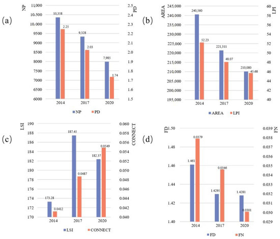 According to Figure 4d, the FD of forest landscape in Lichuan were 1.4611, 1.4295 and 1.4281 in 2014, 2017 and 2020, showing a downward trend, which indicates that the forest landscape was less and less disturbed by external interference. The FN in the three periods were 0.0379, 0.0346 and 0.0301, showing a downward trend. The obvious trend means that the decrease in forest landscape fragmentation and ecosystem service functions were further played. The smaller the disturbance of forest resources at the landscape level, the more beneficial for ecological stability. The more continuous and balanced the spatial distribution, the more beneficial for developing ecological services and maintaining biodiversity.