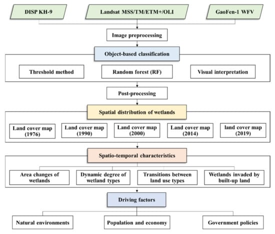 Figure 2 illustrates the flowchart of the methodology. We analyzed the spatial and temporal dynamics of wetlands in the GBA from 1976 to 2019 based on multi-source remote sensing data using the object-based classification method and explored the impact factors affecting wetland changes.