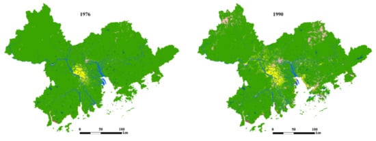 The spatial distributions of land cover types in the GBA from 1976 to 2019.