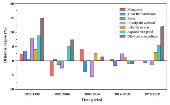 The land use type with most fluctuating dynamic degree among all wetland types is offshore aquaculture, followed by fishponds, both of which have the largest values of dynamic degree in the period of 1976–1990, and then gradually decrease and become negative in the fourth period. This indicates that the fishery develops rapidly at the beginning of the study period, growth becomes relatively difficult after reaching a certain area in the middle period, and the area of freshwater and marine aquaculture approaches saturation in the later period with insignificant dynamic changes. The river is the wetland type with the least dynamic fluctuations, and the absolute value of the dynamic degree does not exceed 1.4% for all time periods. The river is relatively stable and does not increase or decrease drastically in a short period of time, and its total area dynamics are slightly affected by changes in water volume upstream and downstream due to abundant and dry periods, or the construction of reservoirs. The dynamic degree of the lakes/reservoirs was relatively large in the periods of 1976–2014, which may be related to the artificial construction of reservoirs. As for mangroves, they have a negative dynamic degree in the period 1990–2000, which indicates that they were destroyed and their area was greatly reduced during this period. Their dynamic degree increased to 3.96% in 2000–2014, indicating that the mangroves recovered under artificial protection and suitable natural environment. In the period 2014–2019, their dynamic degree was relatively small and positive, indicating that they were well maintained during these years and did not suffer any further extensive damage. For the four time periods from 1976 to 2019, the dynamic degree of the tidal flat/sandbank is positive in the first two time periods, indicating an increase in area, and negative in the last two time periods, indicating a decrease in area. The tidal flats/sandbanks were initially dominated by natural tidal flats, and there was an overall increasing dynamic as new tidal flat wetlands were added due to increased artificial reclamation activities. Later, the reclamation activities decreased and some of the tidal flats were converted to land, so the overall flats/sandbanks decreased again.