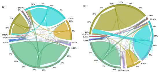 This study used the land use transfer matrix and statistical analysis to quantify the transformation process of each land cover type, for five time periods, including 1976–1990, 1990–2000, 2000–2014, 2014–2019, and 1976–2019. Transitions between land use types in the GBA are illustrated in Figure 5 (corresponding to Table A1, Table A2, Table A3, Table A4 and Table A5) using a chord diagram, which allows the visual representation of the inter-relationships between data in a transfer matrix. These chord diagrams illustrate the land use transitions for different time periods.