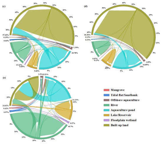 Result showed that the conversion of built-up land to other land types is less, while the invasion of other land types by built-up land gradually increases along its expansion, among which the largest area of invasion belongs to aquaculture ponds, followed by rivers. The invasion of built-up land is spatially scattered. In the main urban area, it is mainly the invasion of aquaculture ponds and farmland, and the specific activities are urbanization and development. In the southernmost area near the sea, it is mainly the invasion of rivers and tidal flats, and the specific activities are land reclamation and wharf construction. In the northern area, it is mainly the invasion of forest land, and the specific activities may be mining and logging and other ecological destruction. The tidal flats/sandbanks are mainly transferred from the sea in the type of other as a result of natural sediment accumulation action and man-made reclamation. There are generally two types of reclamation activities. One is to enclose the sea to create ponds for mariculture, and the other is to reclaim the sea to build construction land such as wharves, so the direction of the tidal flat/sandbank transfer out is mainly aquaculture ponds, offshore aquaculture, and built-up land. During 1990–2000, the reclamation activities were more intense. Thus, more sea areas were converted into tidal flats/sandbanks, which were mainly converted into aquaculture ponds and offshore aquaculture, and partly formed into built-up land under the effect of land reclamation. After 2000, the reclamation activities weakened, the area of sea area converted to tidal flats/sandbanks decreased, and the area of tidal flats/sandbanks transferred out gradually decreased also. The mangroves are mainly turned out for aquaculture ponds and offshore aquaculture, while supplemented by some tidal flats and a small amount of aquaculture ponds and offshore aquaculture. It suffered great damage during 1990–2000 and was better restored and maintained during 2000–2019. There was interconversion between rivers and floodplain wetlands, with a greater number of conversions from the latter to the former, suggesting a wetland development towards the wetter type in the study area. The source of lakes/reservoirs is mainly forest land in the type of other, with more new reservoirs. Aquaculture ponds are a type of wetland that continues to grow in area, mainly converted from agricultural land in the type of other. Aquaculture ponds have interconversion with rivers, lakes/reservoirs, and offshore aquaculture, respectively, but their transfer out to the other three types of wetlands is much less than the transfer in of the other three types to aquaculture ponds, which is one reason why the area of aquaculture ponds keeps growing. Offshore aquaculture is mainly transferred from rivers in the sea or estuary, but also partly indirectly from tidal flats, and the main direction of its transfer out of wetlands is aquaculture ponds.