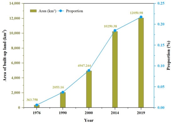 Area of built-up land and proportion of study area from 1976 to 2019.