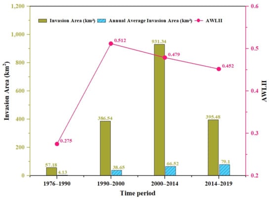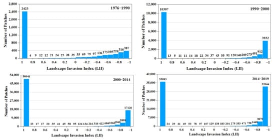 The is calculated for each time period, as shown in Figure 8. The number of patches of wetlands invaded by built-up land during 1976–1990 was 4326, with a comparable proportion of enclave and adjacent invasion type, and the of 0.275. During 1990–2000, the number of wetland invaded patches was 16,740, and enclave-type invasion was the main part in the number of patches in this period. The proportion of patches with LII values close to –1 increased, indicating that the invaded patches of small areas became more numerous. The at this stage was 0.512, which increased compared to the previous time period, and the invaded area of wetlands and the average annual invaded area also increased compared to the previous time period, indicating that the invasion of wetlands by built-up land increased at this stage, and the enclave-type invaded area accounted for a larger proportion of the total invaded area. During 2000–2014, the number of wetland invaded patches was still dominated by enclave-type invasions. The was 0.479, which was slightly reduced compared with the previous phase, but the invaded area of wetlands and the average annual invaded area increased significantly, indicating that the invasion of wetlands by built-up land was still increasing in this phase, but the proportion of adjacent invaded area increased among them, resulting in a smaller . During 2014–2019, adjacent type of invasion becomes dominant in terms of number of patches. The proportion of patches with values close to –1 increased significantly, indicating a further increase in small area invasion and more fragmented wetlands. Compared with the previous phase, decreased slightly to 0.452, and the average annual invasion area increased, indicating that the invasion of wetlands by built-up land was still increasing in this phase, and the proportion of adjacent invasion area increased. Overall, from 1976 to 2019, there is a steady expansion of built-up land and increasing invasion of wetlands. In terms of the number of patches, enclave type invasions were basically predominant before 2014 and adjacent type invasions were predominant after 2014. In terms of patch area, the proportion of adjacent invaded area has been increasing. The proportion of patches with values close to –1 continues to increase, and wetlands are increasingly fragmented (Appendix A).