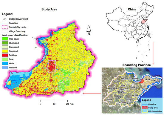 Laizhou is a county-level city in the northeastern part of Shandong Province, China, on the coast of Laizhou Bay in the Bohai Sea (see Figure 2). Laizhou has a land area of 1928 km2 and a coastline of 108 km. It governs 17 towns and streets and 1013 administrative villages, with a permanent resident population of 825,000. Laizhou made full use of its advantages in port, land, and fishery fields to promote rural development and achieved great success. In 2021, the GDP of Laizhou was 70.13 billion RMB yuan, representing an increase of 4.04%. The urbanization rate is 55.3%, which is much higher than the average urbanization rate of 24.2% for the 1900 counties in China. Laizhou is not only one of the top 100 counties of China’s new rural urbanization but also one of the top 100 demonstration cities of China’s village renewal. It is a typical and relatively advanced sample of China’s rural development.