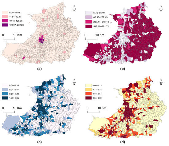 The distribution of the RUS of villages in Laizhou. (a) QPOI; (b) NNI; (c) SHDI; (d) RUS Index.