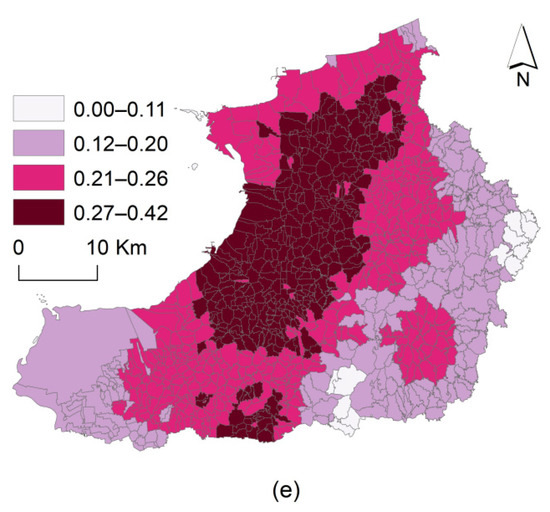 The result of the VRP index is shown in Figure 4. As illustrated in Figure 4e, the number of villages from low to high levels is 39, 211, 472, and 291, accounting for 3.79%, 33.01%, 41.75%, and 21.45% of the area of all regions, respectively. For the spatial distribution, regions with different levels of the VRP index are distributed in clusters. The relatively high values, including (0.21–0.26) and (0.27–0.42), are mainly concentrated in two areas: The first is the core area of Laizhou and its surrounding areas with good geographic location and economic and social conditions; the second is the area with a good geographic location and resource endowment advantages in the east. The relatively low values, including (0–0.11) and (0.12–0.20), are mainly distributed in the southwest coastal saline alkali zone and the eastern mountainous areas, which have poor locations and economic circumstances (see Figure 4a,c).