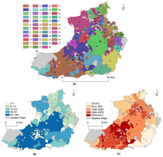 Village clustering in Laizhou based on MCL. (a) The main village clusters; (b) The size of village clusters; (c) The ties of village clusters.