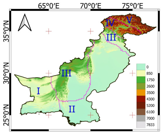 Pakistan has five climate zones based on temperature (Figure 1) [54]: the hot desert climate in the southwest (Zone I), the southeast and east plains with moderate winter and hot summer (Zone II), the elevated central region with cold winter and mild summer (Zone III), cold sub-Himalayan ranges in the north (Zone IV) and a cold mountain climate in the far north (Zone V).
