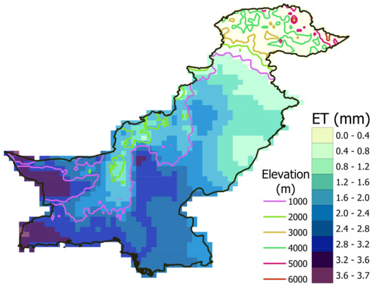 The study was accomplished using Princeton Global Meteorological Forcing (PGF) [55] daily maximum temperature (Tmax), minimum temperature (Tmin), relative humidity (RH), wind speed (WS), surface pressure (SP) and solar radiation (SR) data, as described in Table 1. The global in situ datasets are combined with the NCEP/NCAR reanalysis to generate the PGF data by the Land Surface Hydrology Research Group of Princeton University. Numerous studies used this data for global [56] and regional climate analysis, including in Africa [57,58,59,60,61], Asia [62,63,64], Canada [65] and the USA [66]. Several climatic studies have also been conducted in Pakistan using the PGF climate data [54,64,67,68]. Figure 2 presents the spatial distributions of daily average ET obtained using the Penman–Monteith (PM) method. It ranges from nearly 0.4 in the southern coastal zone to 3.7 mm in the western desert. ET decreases gradually to the north and reaches its minimum in the northern Himalayan region.